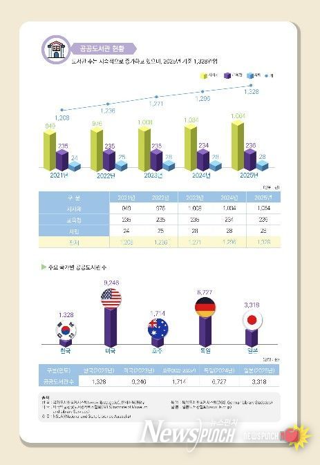 뉴스펀치 정홍균 기자 | 문화체육관광부는 한국도서관협회와 함께 실시한 ‘2026년 전국 공공도서관 통계조사(2025년 실적 기준)’ 결과를 발표했다. 이번 조사는 전국 1,328개 공공도서관의 현황을 분석한 국가승인통계로서 대한민국 도서관 서비스의 양적·질적 성장을 한눈에 보여준다.