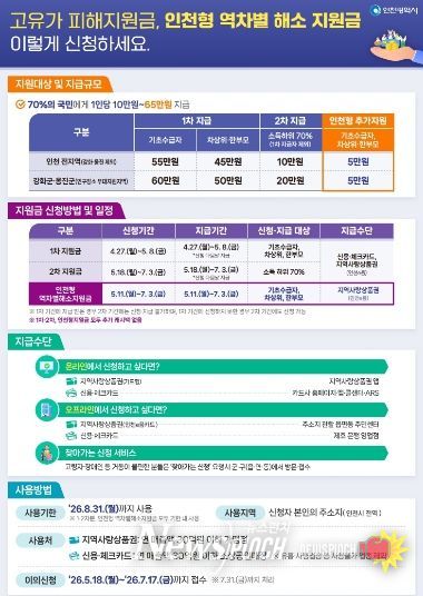 이와 함께 지역 간 지원 격차를 보완하기 위한 ‘인천형 역차별 해소 지원금’ 5만 원도 5월 11일부터 취약계층을 대상으로 추가 지급될 예정이다.