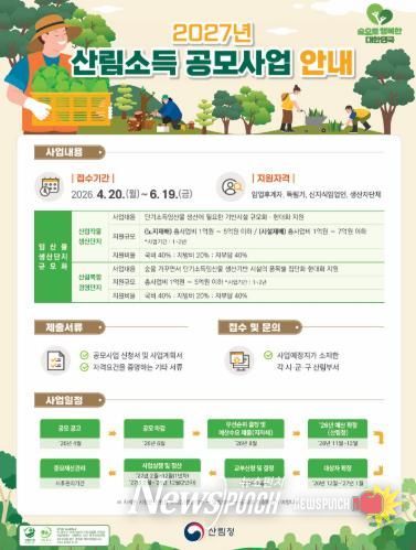 뉴스펀치 김용희 기자 | 고흥군은 임산물 생산 기반 확충과 임업 경쟁력 강화를 위해 ‘2027년도 산림소득사업(임산물생산단지 규모화)’ 공모사업 신청을 오는 6월 19일까지 접수한다고 밝혔다.