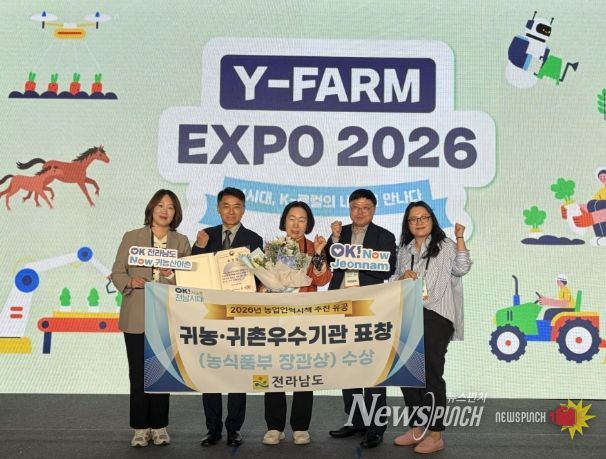 뉴스펀치 김용희 기자 | 전라남도는 24일 수원컨벤션센터에서 열린 ‘2026 와이팜 엑스포(Y-FARM EXPO)’에서 농림축산식품부의 농업인력육성시책 추진 유공자 표창에서 귀농어귀촌 우수시책 추진기관으로 선정돼 장관상을 받았다.