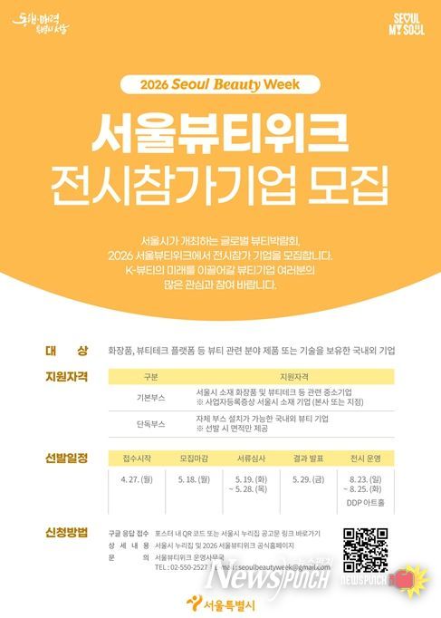 참여를 희망하는 기업은 5월 18일까지 구글 폼을 통해 신청할 수 있으며, 자세한 사항은 서울뷰티위크 공식 누리집 또는 서울시 누리집에서 확인할 수 있다.