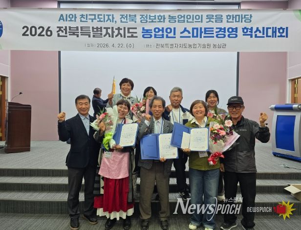 뉴스펀치 정홍균 기자 | 김제시가 『2026년 전북특별자치도 농업인 스마트경영 혁신대회』에서 지난해에 이어 2년 연속 다수 수상이라는 성과를 이어가며 명실상부한 “스마트농업 선도 도시”로서의 입지를 확고히 했다.