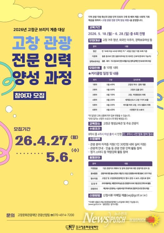 뉴스펀치 정홍균 기자 | 고창문화관광재단은 27일부터 지역 관광 활성화 및 수용태세 개선을 위해 ‘2026년 관광 전문인력 양성사업’ 참여자를 모집한다고 밝혔다.