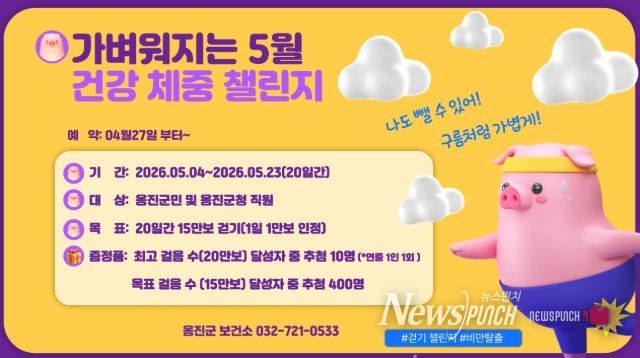 뉴스펀치 정홍균 기자 | 옹진군은 군민의 일상 속 걷기 실천을 유도하고 비만 예방 및 건강체중 관리를 지원하기 위해 5월 4일부터 23일까지 20일간 '가벼워지는 5월, 건강체중'챌린지 참가자를 4월 27일부터 모집한다고 밝혔다.