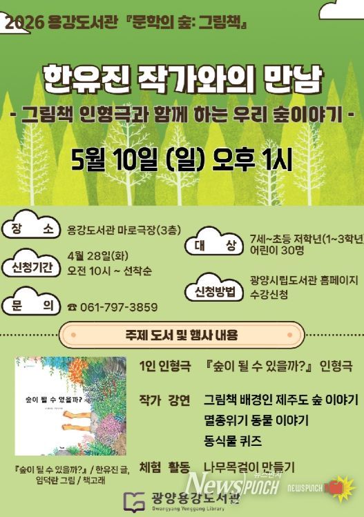 참여 신청은 4월 28일 오전 10시부터 광양시립도서관 누리집에서 선착순으로 진행되며, 모집 대상은 7세부터 초등학교 3학년까지 어린이 30명이다.