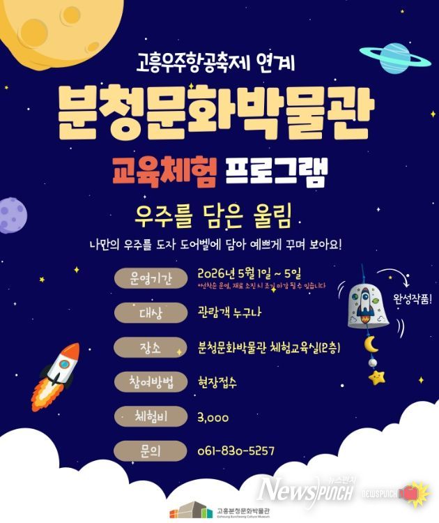 뉴스펀치 김용희 기자 | 고흥군 분청문화박물관은 제16회 고흥우주항공축제와 연계해 관람객과 지역민을 대상으로 특별 교육체험 프로그램 ‘우주를 담은 울림’을 오는 5월 1일부터 5일까지 한시적으로 운영한다고 밝혔다.