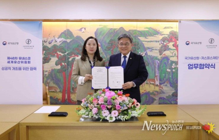 뉴스펀치 정홍균 기자 | 국가유산청은 저스피스재단과 4월 24일 오후 2시 국립고궁박물관(서울 종로구)에서 제48차 유네스코 세계유산위원회 회의(48th Session of the World Heritage Committee)의 성공적 개최를 위한 업무협약을 체결했다.