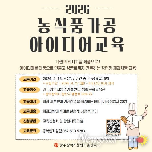 뉴스펀치 김용희 기자 | 광주광역시 농업기술센터는 제과·제빵 창업을 희망하는 예비창업자를 대상으로 ‘농식품 가공 아이디어 교육’을 5월 13일부터 27일까지 총 5회 과정으로 운영한다.