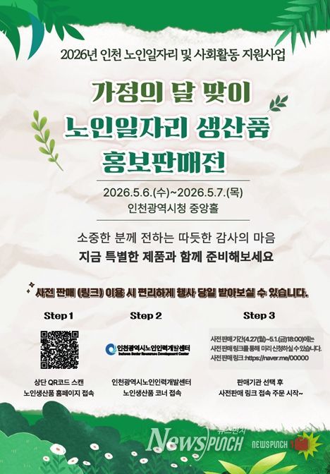 뉴스펀치 정홍균 기자 | 인천시가 2026년 노인일자리 사업을 대폭 확대하고, 5월 가정의 달을 맞아 어르신들이 직접 제작한 생산품을 시민들에게 선보이는 홍보·판매 행사를 개최한다.