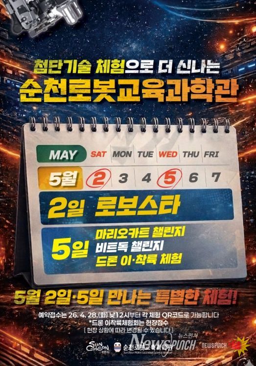 뉴스펀치 김용희 기자 | 순천시 순천로봇교육과학관에서는 5월을 맞아 특별 과학프로그램을 운영한다. 이번 프로그램은 초‧중‧고 학생들이 다양한 과학을 체험하고 흥미를 키울 수 있도록 마련했다.