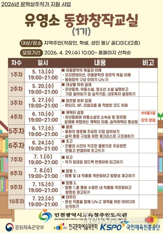 뉴스펀치 정홍균 기자 | 인천광역시교육청주안도서관은 오는 29일부터 지역 주민을 대상으로 ‘유영소 동화작가와 함께하는 동화창작교실(1기)’ 참여자를 모집한다.