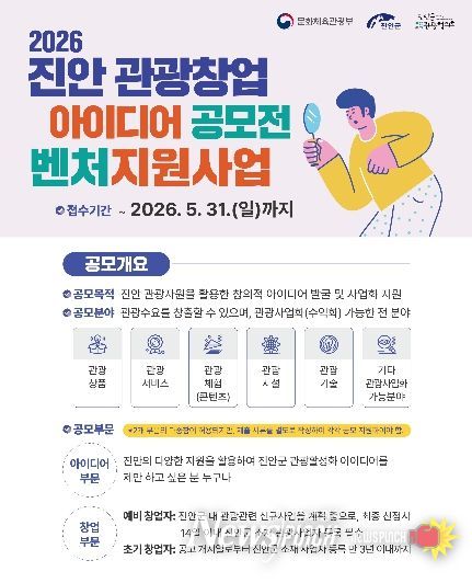 뉴스펀치 정홍균 기자 | (사)진안군관광협의회(이사장 이재동)가 지역 관광자원을 활용한 창의적인 아이디어를 발굴하고 실질적인 사업화를 지원하기 위해 ‘2026 진안 관광창업 아이디어 공모전’을 개최한다.