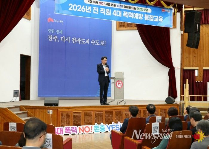 뉴스펀치 정홍균 기자 | 전주시는 28일 시청 강당에서 우범기 전주시장을 비롯한 5급 이상 간부 공무원 100여 명을 대상으로 ‘2026년 직장 내 4대 폭력 예방 통합교육’을 실시했다.