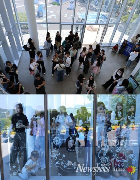 통유리 외벽 전체를 캔버스로 활용한 퍼포먼스에 음악이 더해지며 현장 분위기를 한층 끌어올렸다.
