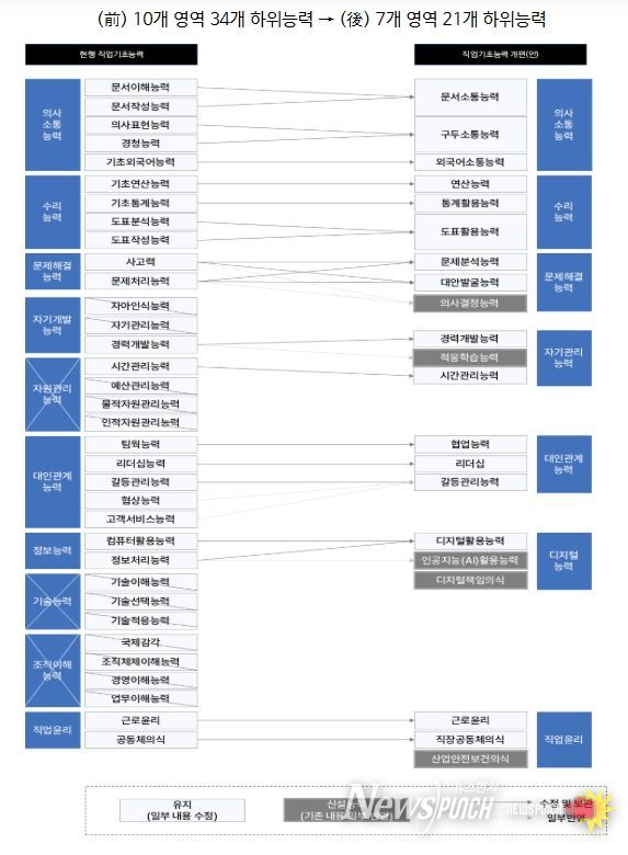 뉴스펀치 정홍균 기자 | 고용노동부는 직업기초능력을'직업공통능력'으로 명칭을 변경하고, 미래 핵심 역량을 포함한 7개 영역으로 전면 개편한다.
