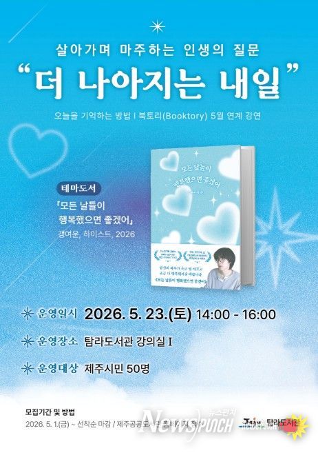 뉴스펀치 김용희 기자 | 제주시 탐라도서관은 삶과 글을 통해 현대인의 일상 속에서 행복을 발견하고, 스스로를 돌보는 방법을 제시하기 위해 5월 북토리 강연을 운영한다.