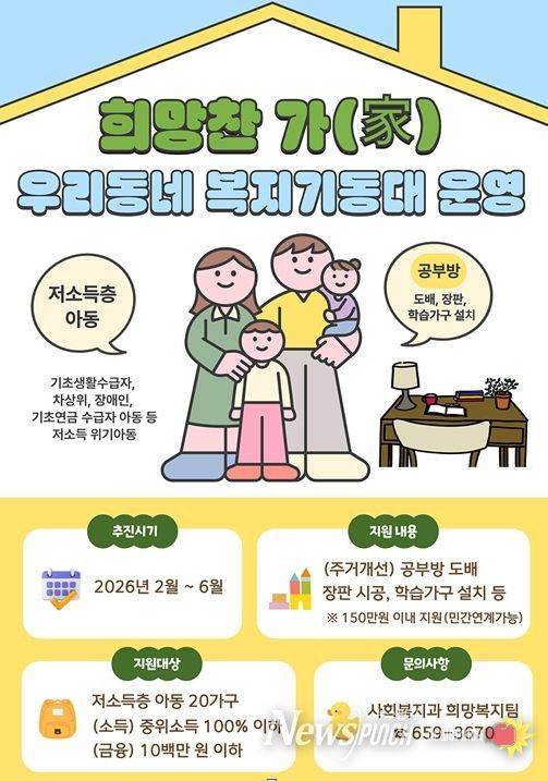 뉴스펀치 김용희 기자 | 여수시는 저소득층 아동의 학습 여건 개선과 안전한 주거공간 조성을 위해 2026년 주거환경 개선사업 ‘희망찬 가(家)’를 추진한다고 밝혔다.