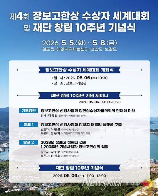 뉴스펀치 김용희 기자 | 사단법인 장보고글로벌재단(이사장 김덕룡)이 창립 10주년 기념식 및 제4회 장보고한상 수상자 세계대회를 5월 5일부터 8일까지 완도에서 개최한다고 밝혔다.