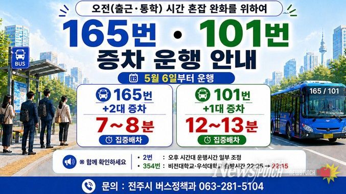 또한 101번 노선에도 예비 차량 1대가 추가 투입된다. 101번 노선은 평화동종점에서 출발해 △성심여중고 △신흥중고 △전주여상 △한일고 △전주지방법원 △월드컵경기장 △여의동, 팔복동을 거쳐 전북대까지 운행하는 노선으로, 주요 중고등학교와 대학교를 경유하는 만큼 등교 시간대에는 학생과 일반 이용객이 집중되면서 혼잡도가 높은 노선이다.
