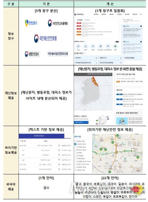 기상특보나 사고정보 등 실시간 재난상황 정보를 제공하는 재난 유형은 기존 9종에서 26종으로 확대된다. 특히 재난별 상황정보, 재난문자, 대피소 위치, 국민행동요령을 통합 안내함으로써 위기 상황에서 국민이 신속하게 대처할 수 있도록 돕는다.