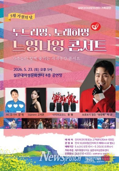뉴스펀치 김용희 기자 | 제주특별자치도 설문대여성문화센터는 오는 5월 23일 오후 5시 센터 4층 공연장에서 ‘설문대 문화의 날’ 5월 기획공연으로 '두드리멍 노래하멍 느영나영 콘서트'를 개최한다고 밝혔다.