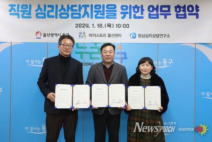 뉴스펀치 임정용 기자 | 울산시 동구청은 1월 18일 오전 10시 심리상담기관인 마이스토리 울산센터(대표 이석주), 청심심리상담연구소(소장 고원자)와 ‘울산 동구청 소속 직원 심리상담 지원’을 위한 업무협약식을 체결했다