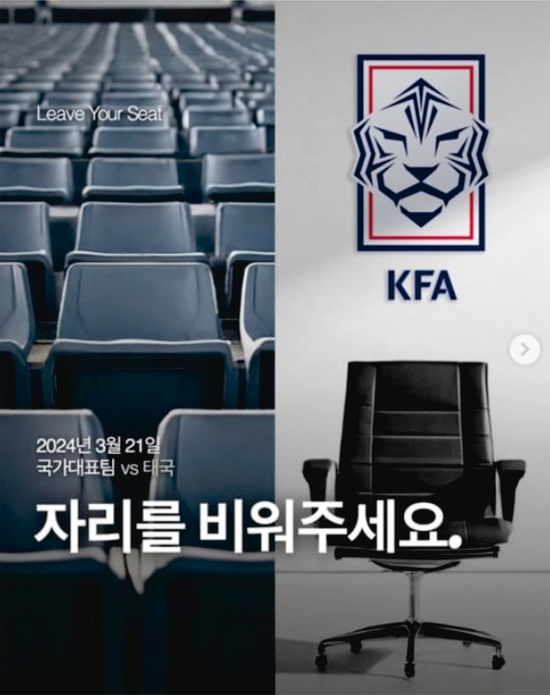 팬들은 “축구협회장 정몽규는 본인의 사익을 위해 선수들을 벼랑 끝에 내몰아 왔다. 선수들은 침묵할 수밖에 없다. 선수들을 위해 이젠 우리가 대신 행동한다”면서 ‘Leave Your Seat, 자리를 비워주세요’라는 문구와 함께 태국전 보이콧을 주장했다.