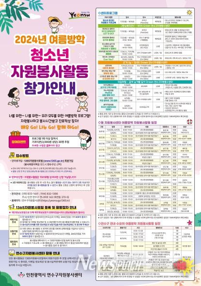 뉴스펀치 김성남 기자 | 연수구자원봉사센터(센터장 권희정)는 오는 7월 22일부터 8월 9일까지 연수구 관 내 청소년의 자원봉사 활동 활성화를 위한 '2024 배우GO! 나누GO! 함께하GO! 청소년 여름방학 자원봉사학교'를 운영한다.