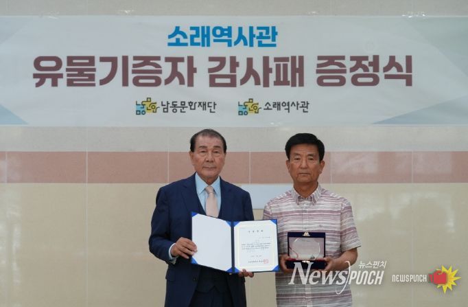뉴스펀치 김성남 기자 | 인천시 남동구 남동문화재단은 지역사 연구·발전을 위해 소래역사관에 유물을 무상으로 기증한 이수영 씨에게 기증증서와 감사패를 전달했다고 17일 전했다.