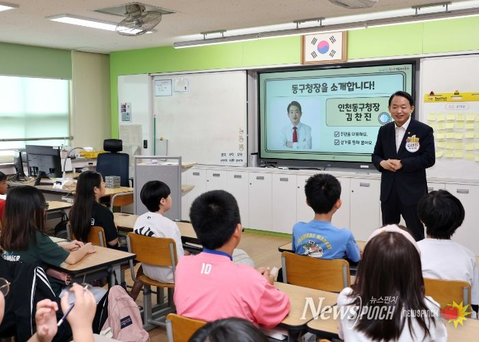 뉴스펀치 김성남 기자 | 김찬진 동구청장은 17일 관내 창영초등학교를 찾아 5학년 1반 학생들과 함께 ‘행복한 우리 동구 만들기’ 토론수업을 진행했다.