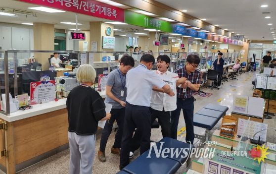 훈련은 자동차 번호 변경 신청을 위해 방문한 민원인이 민원 처리 도중 공무원에게 폭언 및 폭력을 가하는 상황을 가정해 이뤄졌다.