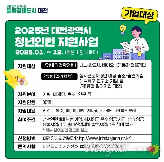 뉴스펀치 이현승 기자 | 대전시는 2025년 청년인턴 지원사업에 참여할 기업과 청년인턴 80명을 공개 모집한다.