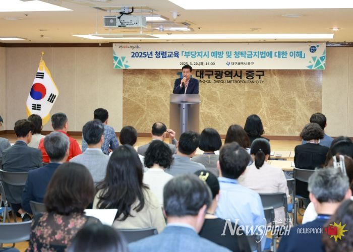 이번 교육에는 류규하 중구청장을 비롯해 중구의회 의원, 국장, 부서장, 부패취약분야 업무 담당자 등 100여 명이 참석해 청렴한 공직자로서 자세를 되새기고 실천적 윤리의식을 높이는 시간을 가졌다.