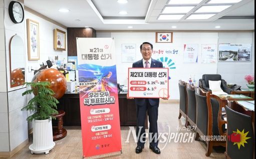뉴스펀치 김길룡 기자 | 홍성군은 지난 23일, 이용록 홍성군수가 오는 6월 3일 실시되는 제21대 대통령선거를 앞두고 유권자의 소중한 한 표를 독려하는 릴레이 캠페인에 참여했다고 밝혔다.