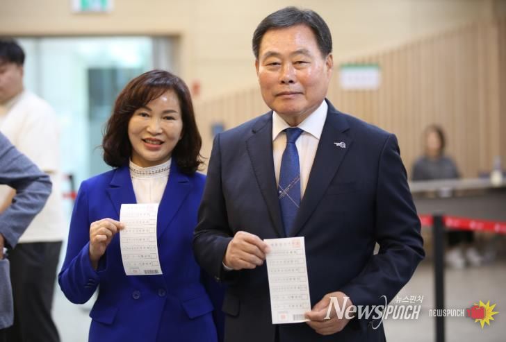 뉴스펀치 안철우 기자 | 김산 무안군수는 제21대 대통령 선거 사전투표 첫날인 29일, 부인 장예운 여사와 함께 무안읍 승달문화예술회관에 마련된 사전투표소를 찾아 군민들과 함께 소중한 한 표를 행사했다.