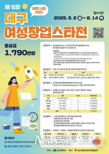 뉴스펀치 조평훈 기자 | 대구광역시는 예비 여성창업자와 새내기 여성창업자의 참신한 창업 아이디어를 발굴하고 성공적인 창업을 지원하기 위해 ‘2025년 제5회 대구 여성창업스타전’에 참가할 (예비)여성창업가를 6월 2일부터 8월 14일까지 모집한다.