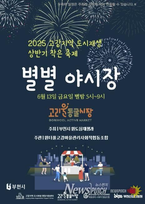 뉴스펀치 탁상훈 기자 | 부천시는 6월 13일 오정구에 소재한 고리울 동굴시장에서 ‘2025년 상반기 고강지역 작은 축제, 별별 야시장’을 개최한다고 11일 밝혔다. 이번 행사는 부천시 원도심재생과가 주최하고, 원더풀고강마을관리 사회적협동조합이 주관한다.