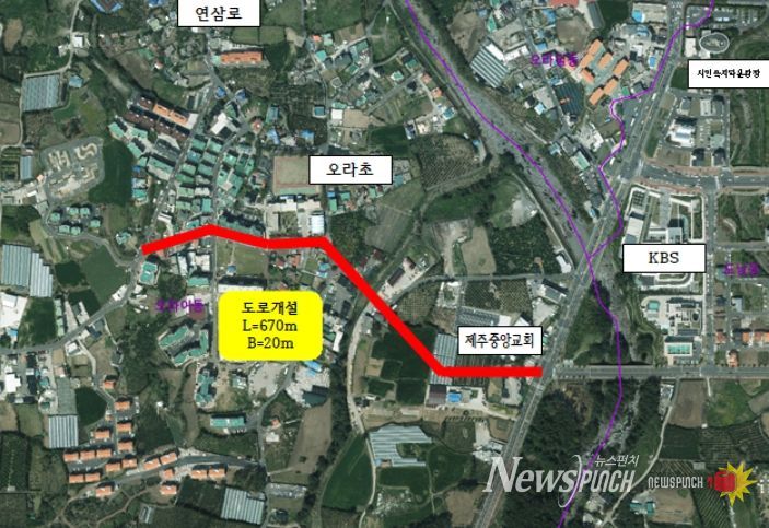 뉴스펀치 천세두 기자 | 제주시는 오라초~오남로간(중로1-1-56호선) 도시계획도로 개설사업에 특별교부세 6억 원을 확보함에 따라 올해 12월 조기 준공할 계획이다.