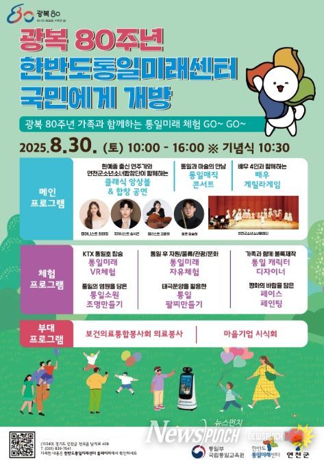 뉴스펀치 김희경 기자 | 통일부 국립통일교육원 한반도통일미래센터는 8월 30일, 광복 80주년을 맞아 국민과 함께하는 '광복 80주년 기념, 대국민 개방행사'를 개최한다.