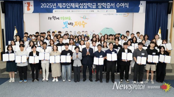 뉴스펀치 천세두 기자 | 제주특별자치도가 27일 오전 10시 도청 탐라홀에서 2025년 제주인재육성 장학금 장학증서 수여식을 열고, 제주 출신 고등학생 및 대학(원)생 222명에게 장학금을 전달했다.
