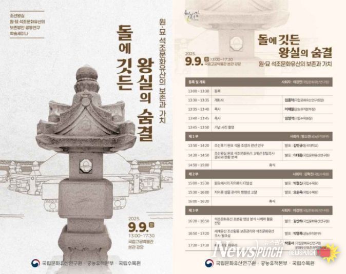 뉴스펀치 김희경 기자 | 국가유산청 국립문화유산연구원과 궁능유적본부는 산림청 국립수목원과 함께 오는 9월 9일 오후 1시 국립고궁박물관 본관 강당(서울 종로구)에서 ‘돌에 깃든 왕실의 숨결, 원·묘 석조문화유산의 보존과 가치’를 주제로 학술발표회(세미나)를 공동 개최한다.