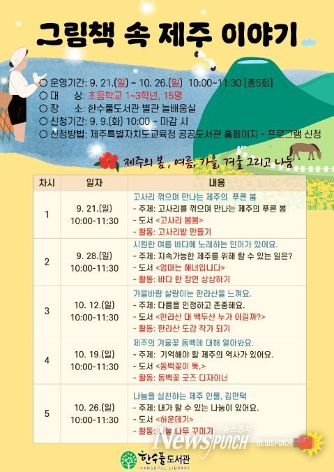 뉴스펀치 천세두 기자 | 제주도교육청 한수풀도서관은 오는 21일부터 10월 26일까지 매주 일요일 초등학교 1~3학년 어린이를 대상으로 제주 관련 그림책 읽기 프로그램 ‘그림책 속 제주 이야기’를 운영한다.