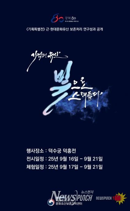 뉴스펀치 김희경 기자 | 국가유산청 국립문화유산연구원 문화유산보존과학센터는 광복 80주년을 맞아 오는 9월 16일부터 21일까지 6일간 덕수궁 덕홍전(서울 중구)에서 광복과 독립운동의 상징적 유물이 보존처리를 통해 어떻게 되살아났는지 그 과정을 영상과 사진으로 조명한 기획전 '기억의 유산, 빛으로 스며들다'를 개최하고, 9월 16일 오후 2시에 개막식을 개최한다.