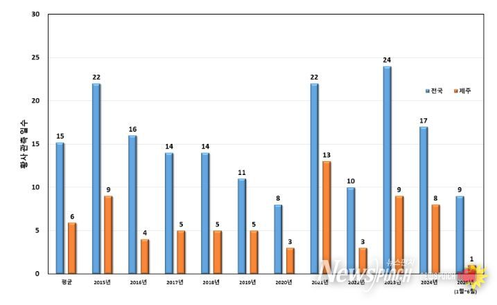 뉴스펀치 천세두 기자 | 제주특별자치도 보건환경연구원은 올해 상반기 제주지역 황사 관측일수가 1일에 그쳐 지난해 같은 기간 8일 대비 크게 감소했다고 밝혔다.