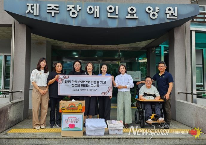 뉴스펀치 천세두 기자 | 제주도교육청 신촌초등학교 보호자 재봉틀 동아리는 2일 1학기 동안 정성껏 만든 턱받이와 앞치마를 제주장애인요양원에 기부하며 따뜻한 나눔을 실천했다.