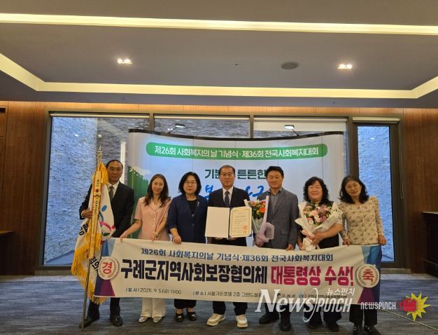 뉴스펀치 강길수 기자 | 전남 구례군은 지난 5일 ‘기본이 튼튼한 복지 강국’을 주제로 열린 제26회 사회복지의 날 기념식에서 구례군지역사회보장대표협의체(공공위원장 김순호, 민간위원장 임재신)가 지역사회 복지 증진에 기여한 공로를 인정받아 대통령 표창을 수상했다고 밝혔다.