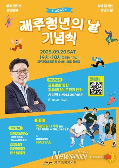 뉴스펀치 천세두 기자 | 제주특별자치도는 20일 제주콘텐츠진흥원 비인(BeIN;)공연장에서 ‘2025 제주청년의 날 기념식’을 개최한다.