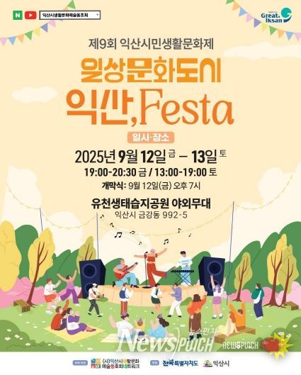 9일 익산시에 따르면 '제9회 익산시민생활문화제–일상문화도시 익산, 페스타(Festa)'가 오는 12일 오후 7시 유천생태습지 야외무대에서 개막식을 시작으로 13일까지 이틀간 개최된다.
