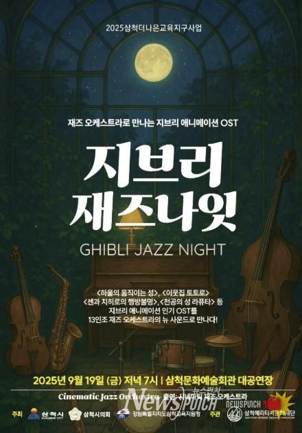 뉴스펀치 김보성 기자 | 삼척시와 삼척시의회, 삼척교육지원청이 주최하고 (재)삼척헤리티지문화재단이 주관하는'지브리 재즈나잇'공연이 오는 9월 19일 오후 7시 삼척문화예술회관 대공연장에서 개최된다.