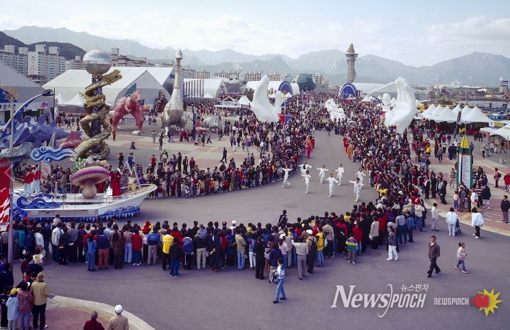 황병진 작가의 ‘1999 강원 국제관광엑스포 축제’는 변화하는 속초의 역사적 흔적을 기록하며 관람객의 향수를 자극한다.